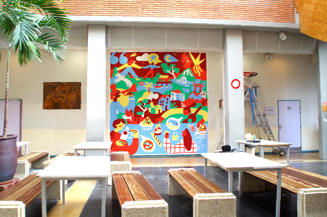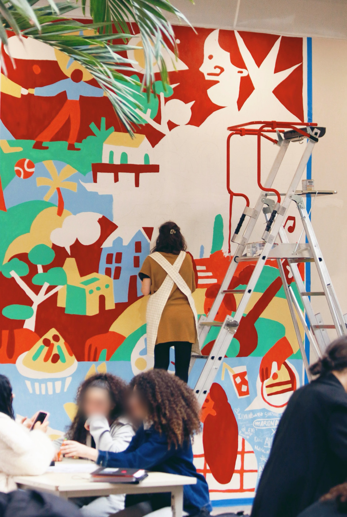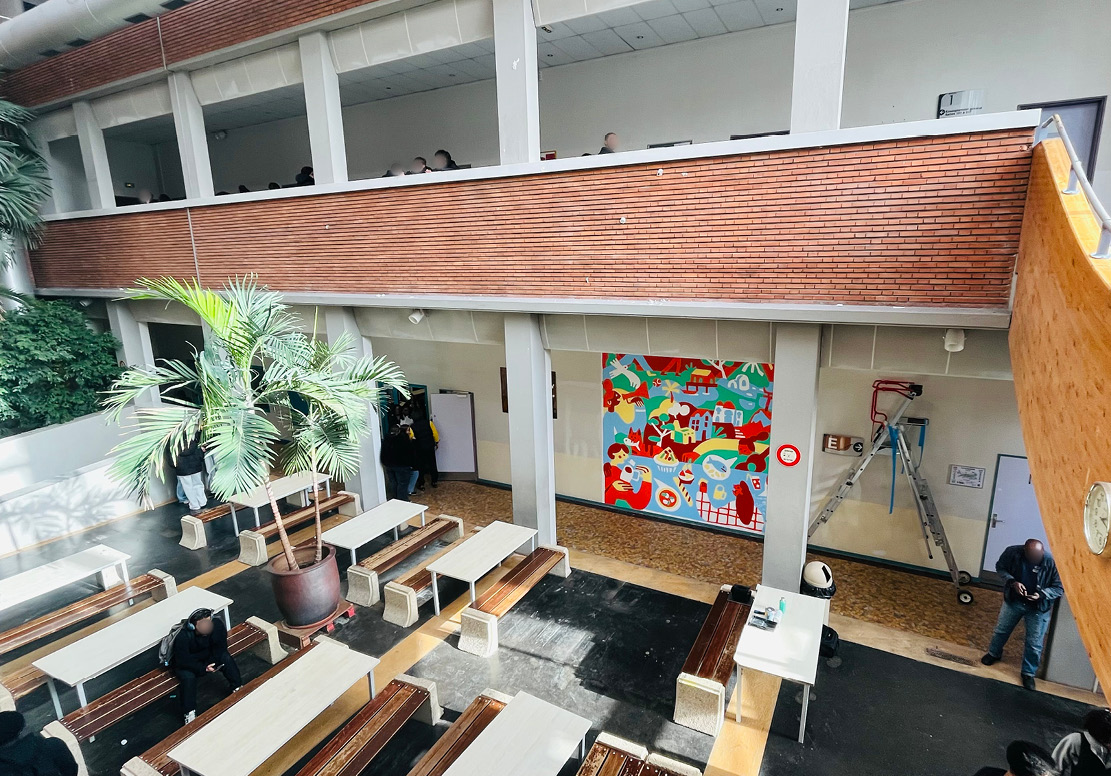 Dans le cadre de la semaine des langues 2026 et en collaboration avec une classe de seconde du Lycée Georges Clémenceau de Villemomble, mise en place d’un atelier puis création d’une illustration sur le thème « Construire un monde commun par le dialogue » pour la réalisation d’une fresque murale de 4x4m dans l’atrium de l’établissement.