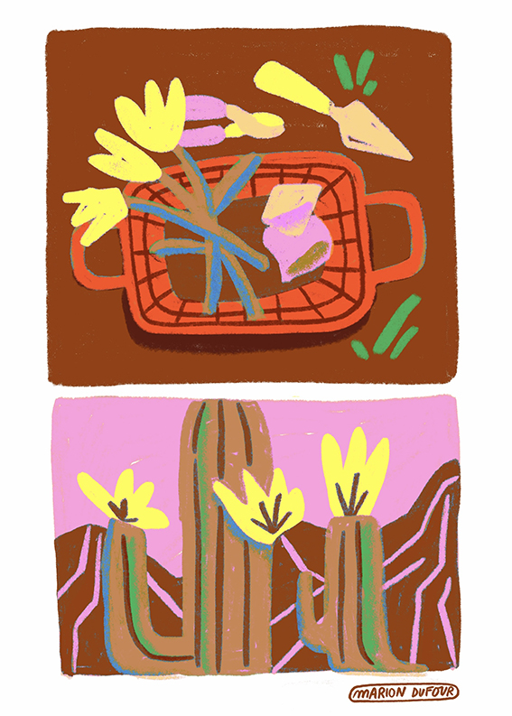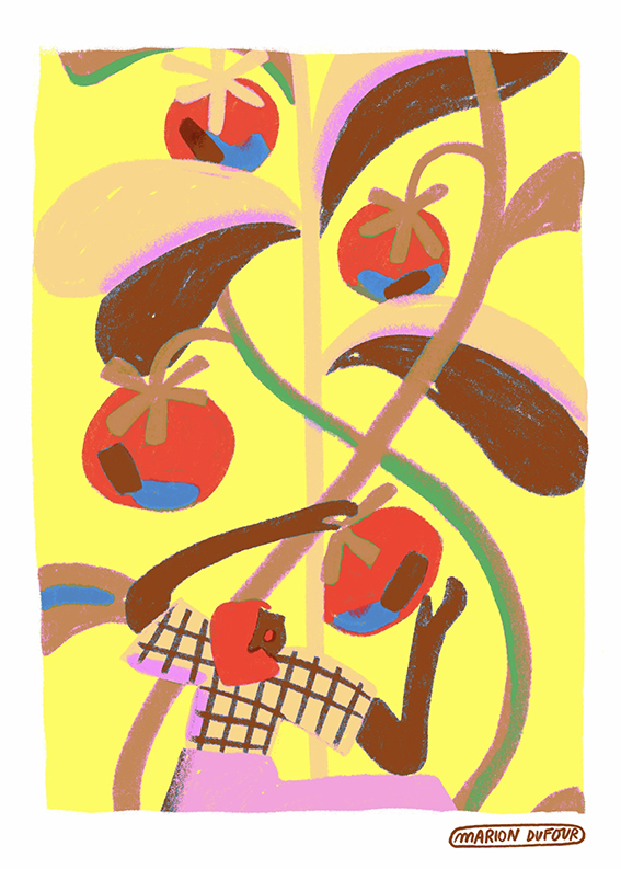 La récolte des jours d’été Illustrations personnelles, 2026. Pastel, crayon et outils numériques. Tirages à l’encre pigmentaire sur papier Fine Art Cotton Textured, 300gr/m2. © Marion Dufour Catégorie(s) : Illustration